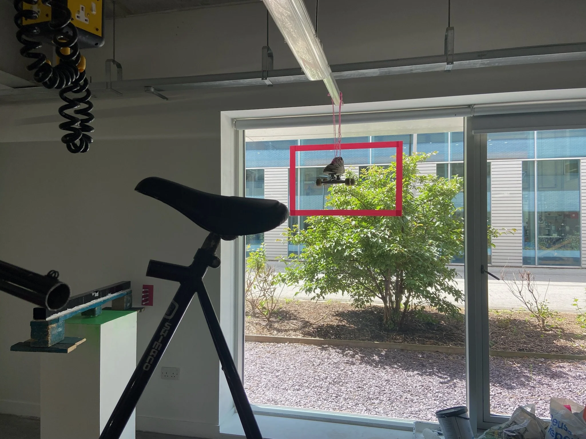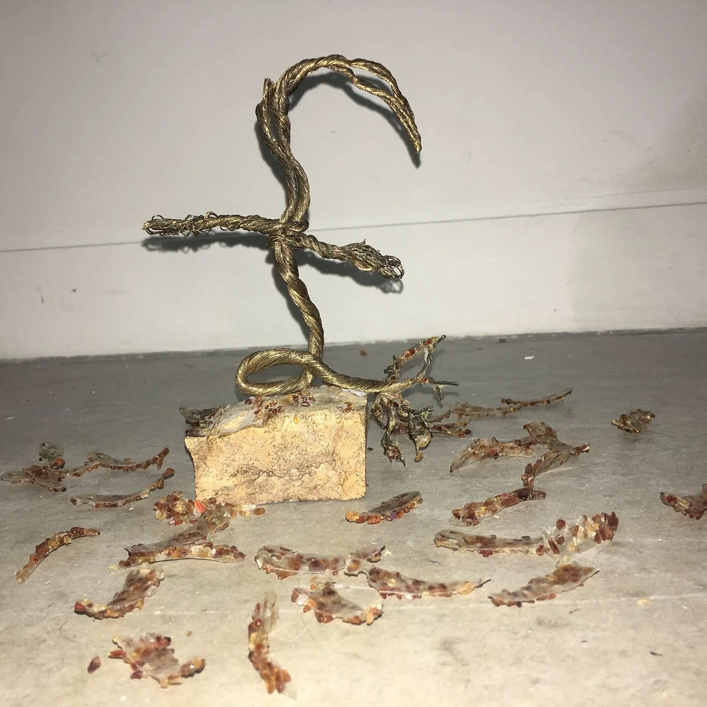 Demonstration of a long lighter made from wood, a caulk gun, strimmer wire and a lighter.